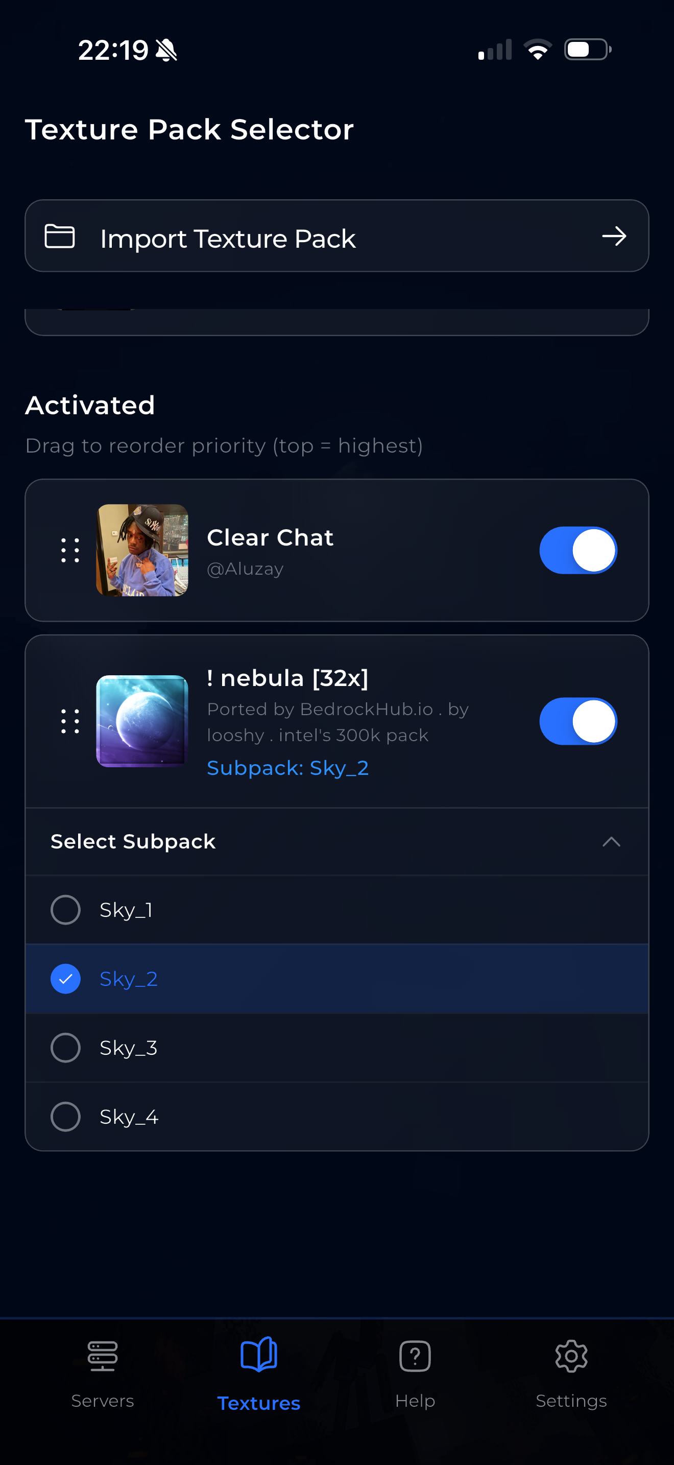 Some packs include subpacks — multiple options bundled in one file. For example: a sky pack with 4 different sky styles, or a pack with high-res and low-res versions.