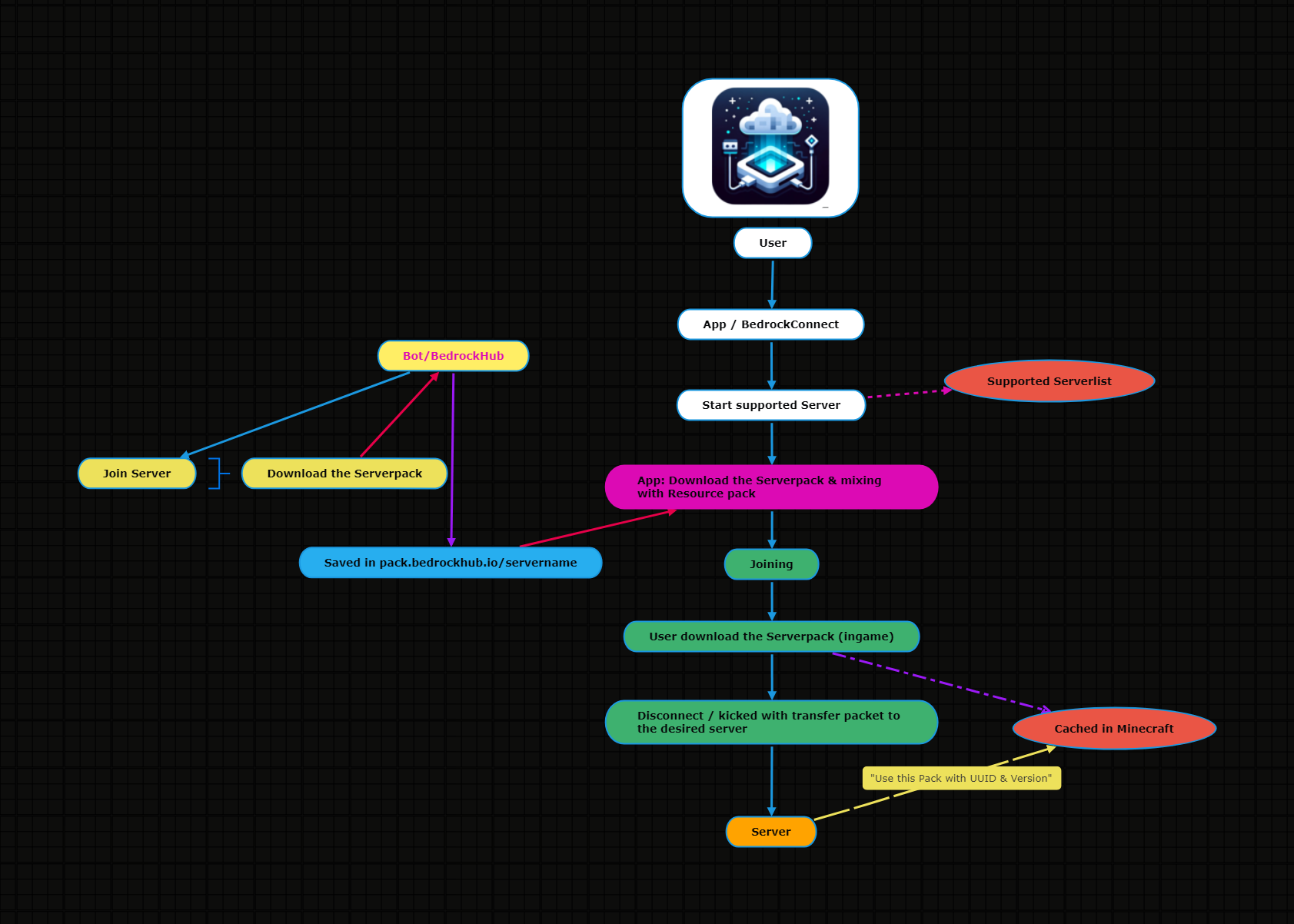 **BedrockConnect exploits this mechanism** by using either a provided ([our own server pack](https://wiki.bedrockconnect.app/for-server-owners-business/how-can-i-add-my-server-to-the-support-list)) or automatic system to obtain the pack and keep it up to date. Before you join the server, the app downloads the server pack in the background [(if the server is supported)](https://wiki.bedrockconnect.app/quickstart/premium-features/the-custom-resource-pack-method/on-which-server-can-i-have-a-resource-pack) and combines it with your selected resource pack.